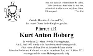 Pater Kurt Hoberg wurde mitten im zweiten Weltkrieg am 25. März 1940 in Wissen an der Sieg geboren. Sein Theologie Studium absolvierte er in Paderborn und Würzburg. Es tritt dem Orden des Oblaten des Hl. Franz von Sales bei. Am 9. Juni 1973 wird er in Paderborn zum Priester geweiht. Von da an wirkt ier in den Ordenseinrichtungen unter anderem in Paderborn und Haus Overbach.