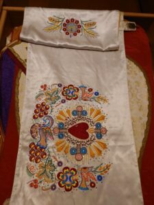 In den gleichen leuchtenden Farben wie die Darstellung des Hl. Georg ist auch die Heilige Familie auf der Rückseite der Fahne angelegt. Gezeigt sind Maria und Joseph, das halbwüchsige Kind in ihrer Mitte, vermutlich bei ihrer Rückkehr aus Ägypten.“
